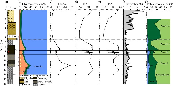 图2: a)水塘坝剖面岩性柱,b)粘土矿物组合,c)高岭石/蒙脱石比值,d)CIA指数 ,e)PIA指数,f)和粘土组分含量,g)和孢粉组合