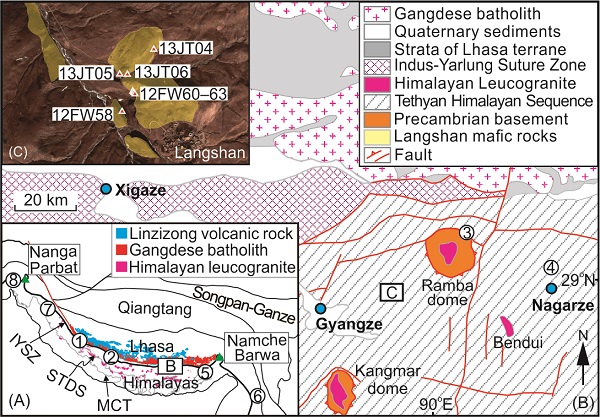 随着新特提斯洋(Neo-Tethys ocean)的闭合,印度和欧亚大陆发生碰撞最终导致了青藏高原的形成。青藏高原作为陆陆碰撞造山带的代表,是研究陆陆碰撞造山过程的经典地区,长期以来受到了国内外学者的广泛关注。然而,该造山作用的一些重要过程还不甚明确,其中一个重要科学问题就是新特提斯洋板片的断离时间。大洋板片断离是造山带演化过程中的关键环节之一,大洋板片断离后主导大洋俯冲-大陆会聚的重要动力(深部板片拖拽力)会消失,软流圈会沿着断离带发生快速上涌加热上覆板块。因此,大洋板片断离往往对造山带演化产生明显的影响,如超高压岩石的折返、造山带的快速抬升、强烈的岩浆活动、块体间会聚速率明显减小(甚至会聚停止)等。沿着雅鲁藏布缝合带新特提斯洋板片横向延伸超过2500公里(图1A),但目前能够有效制约其断离的直接地质证据主要局限在青藏高原喜马拉雅西缘的西构造结(南迦巴尔特)地区,如超高压岩石的折返和地震层析成像观测等;而缝合带中、东部地区板片断离的时间还缺乏直接证据的约束。