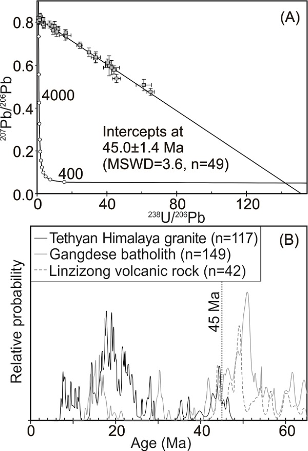 图2 (A)朗山辉长岩榍石SIMS U-Pb定年结果和(B)藏南地区雅鲁藏布缝合带两侧新生代岩浆活动年代学特征。