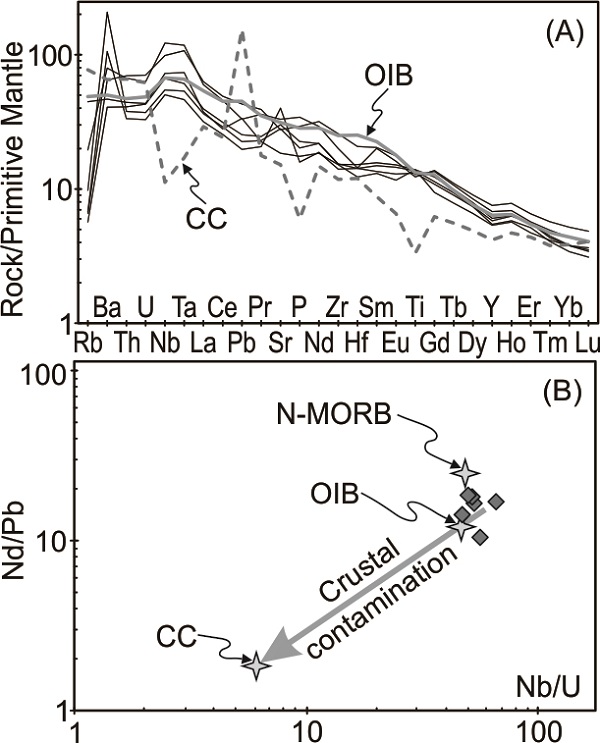 图3 朗山辉长岩地球化学特征与洋岛玄武岩(OIB)岩石相似,与大陆地壳组成(CC)差别明显,并且没有受到明显的陆壳物质混染。
