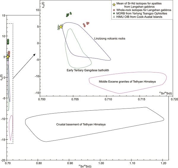 地质地球所岩石圈演化研究室纪伟强副研究员、吴福元研究员及合作者针对上述问题,选择青藏高原南部喜马拉雅东段朗山辉长岩进行了研究(图1)。朗山辉长岩侵位于江孜地区特提斯喜马拉雅晚白垩世-早第三纪宗卓组中。该辉长岩的形成年龄是始新世中期(榍石SIMS U-Pb定年结果:45.0±1.4 Ma,图2A),具有HIMU-OIB(洋岛玄武岩)型地球化学特征(图3A)和亏损的Sr-Nd同位素组成(磷灰石原位分析:87Sr/86Sr(t) = 0.70312 ~ 0.70317、εNd(t) = +4.9 ~ +5.0)。根据岩石的稀土元素配分形式和熔融条件估算表明,其来自于浅部石榴石相地幔的熔融。通过详细的源区识别和成因机制分析,他们认为该岩石最可能的源区为受大洋板片熔体交代的软流圈地幔,并且岩浆形成后运移、侵位过程中未受到明显的陆壳物质混染(图3),最可能的成因机制为新特提斯洋板片的断离作用。