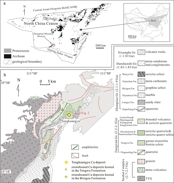 铜矿峪铜矿位于华北克拉通南缘的中条山地区,地处山西省运城市垣曲县,早在唐、宋时代就进行过开采和冶炼,具有悠久的历史,是我国北方最大的铜矿床之一。由于矿床经历了较强烈的变质和变形作用,原始宏观形貌受到了改造。上世纪五十年代有学者依据斑岩的存在、岩浆硫同位素特征等提出铜矿峪为变质斑岩型矿床,这一认识虽然延续至今,但仍存在争议。因此,关于其是否属于斑岩型矿床的问题已成为人们关注的焦点。