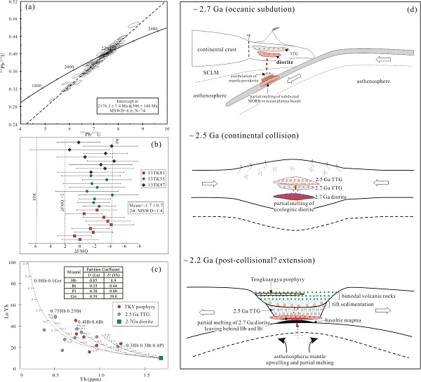 图3:(a)铜矿峪斑岩锆石U-Pb谐和图;(b)铜矿峪斑岩锆石氧逸度图;(c)铜矿峪斑岩La-Yb地球化学模拟图;(d)中条山地区2.7Ga至2.2Ga大地构造演化模式图