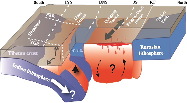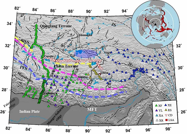 大约50个百万年以来,印度板块与欧亚板块开始完全的陆陆碰撞,印度板块俯冲于青藏高原之下,并持续向北运动,在持续汇聚挤压作用下,青藏高原形成了巨厚的地壳和平均5千米的高原。因青藏高原地域宽广,其主要构造特征表现为南北向的显著差异,为探明深部地壳和岩石圈结构特征,前人在青藏高原开展了大量的以南北走向测线观测为主的流动地震观测,而针对高原深部结构东西向差异的研究少有地球物理观测计划,这也导致对青藏高原下伏的印度大陆岩石圈几何形态缺乏足够的东西向约束。近年来高原深部结构的东西向差异逐渐被研究人员重视,中国科学院地质与地球物理研究所特提斯研究中心构造物理学科组在青藏高原中部拉萨地体北部有针对性地布设了一条东西向的600km长共计58个台站的宽频带流动地震剖面(TIBET-31N)以探测高原深部结构的东西向差异。