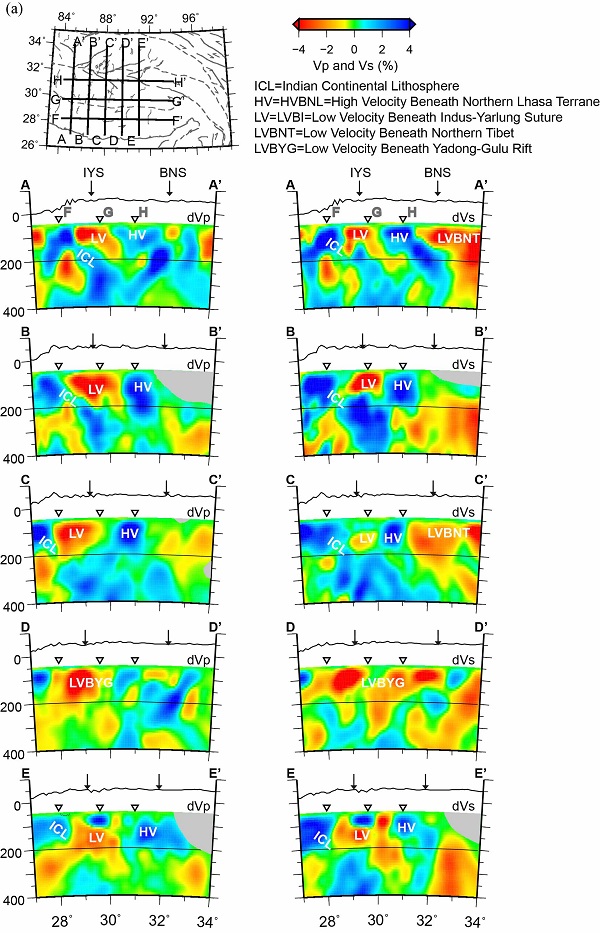 为了探明青藏高原中部下伏印度大陆岩石圈的几何形态,特提斯研究中心梁晓峰副研究员与合作者等人,综合青藏高原中南部现已有宽频带流动地震台站记录的大量地震波形数据,并结合TIBET-31N剖面,构建了包括9个野外观测项目共计445个宽频带地震台站的地震数据(图1),针对青藏高原上地幔结构进行有限频走时层析成像研究,获取了青藏高原中南部的三维上地幔速度结构图像。结果显示(图2):印度大陆岩石圈所表现的地震波高速异常在班公湖-怒江缝合带以南以40°的高角度向北延伸,且此角度自西向东变陡,该图像可能反映了印度大陆岩石圈在俯冲过程中发生的拆沉-断离过程(图3);同时,在89°E附近存在一个南北走向的显著低速异常,延伸深度超过300km穿过了俯冲的印度岩石圈,将藏南上地幔顶部的低速和藏北上地幔大范围的低速异常相互连通。这些结果表明(图4):印度大陆岩石圈以陡角度在青藏高原中南部上地幔俯冲到接近班公湖-怒江缝合带,同时,印度大陆岩石圈在亚东-谷露裂谷西侧发生撕裂,引起软流圈物质上涌,并联通了高原南部和藏北的大范围低速区域。