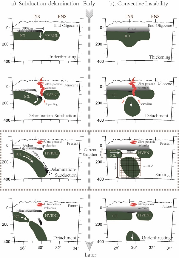 图3:两种可能用于解释观测到的北倾高角度高速异常形态的演化模式图:(a)俯冲-拆沉模式;(b)对流失稳模式