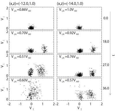 图3 在选定时刻离子在垂直与平行平面内随特定时间的离子速度散点分布。VLA为局地阿尔文速度,VA0为初始时刻归一化的lobe区的阿尔文速度
