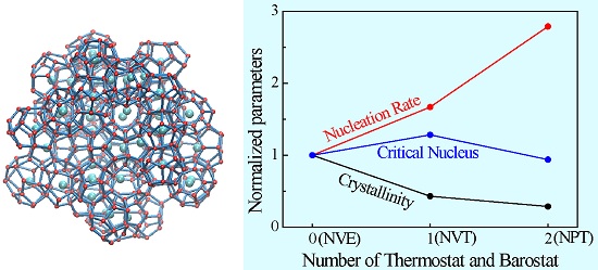 图2:归一化的成核速率、临界核和结晶度随系综(温浴和压浴个数)的变化