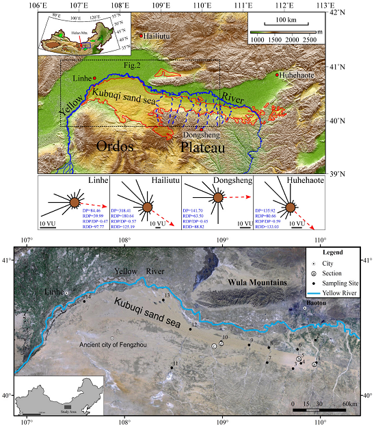 此外,他们通过对历史文献的考证和现代实地状况对比,获得了对库布齐沙漠近3000年以来环境演变与人类活动相互作用关系的初步认识。他们认为该沙漠景观除了受自然因素影响,还与该地区人类活动历史密切相关,分布于沙漠腹地的汉唐时期的多个古城是该区环境变化的佐证。该区丰富的沙源、强劲的风力及人类活动共同促成了该沙漠景观的形成。