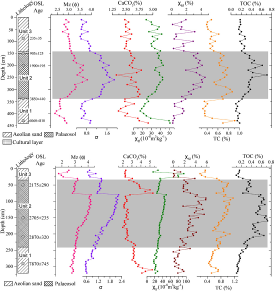 图2 典型风沙-古土壤地层剖面光释光年龄及古环境代用指标变化特征