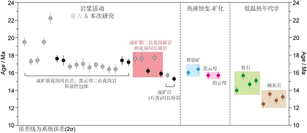 (1)成矿斑岩二长花岗斑岩和花岗闪长斑岩主要在约16.0 Ma侵位,而后热液黑云母和绢云母有着相似的Ar-Ar年龄(15.7 Ma),记录了热液成矿系统的冷却年龄,成矿后的闪长玢岩岩体形成于15.3 Ma,略晚于成矿期岩体。
