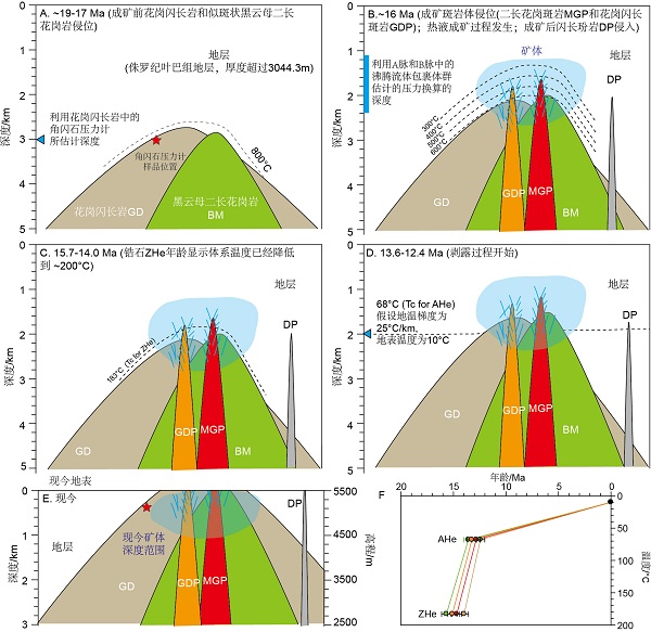 (2)中新世驱龙斑岩铜钼矿床中成矿斑岩经历单向快速冷却的过程(>200°C /m.y.),剥露时间为13.6-12.4 Ma(磷灰石U-Th/He年龄)。结合矿区上覆火山岩地层厚度、流体包裹体测温确定的成矿深度以及岩体的角闪石压力计,综合建立了该巨型斑岩铜矿的岩浆-热液-剥露过程模型,并估算剥露速率为0.16-0.24 mm/y。该速率与前人研究冈底斯岩基的剥露速率相近。