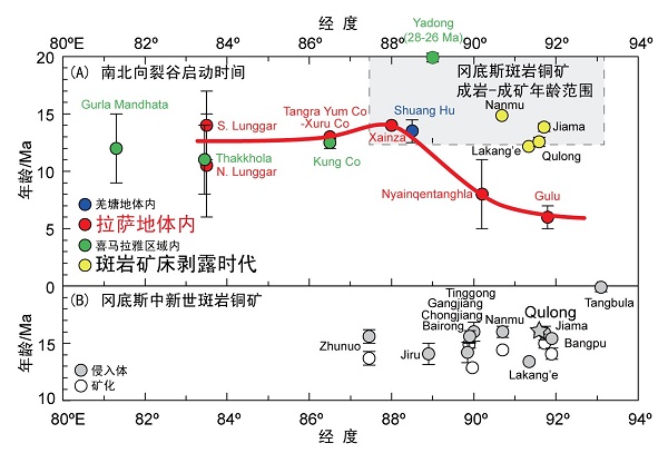 图3 西藏南北向裂谷启动时间与中新世斑岩矿床成岩-成矿-剥露年代的关系
