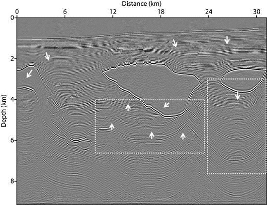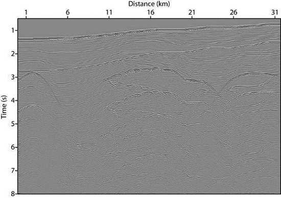 在上述背景下,中科院地质地球所工程地质与水资源研究室刘伊克研究员及合作者提出了可控阶地震多次波最小平方逆时偏移方法,他们依据提出的地震多次波分阶理论,首先将地震多次波分解成1阶多次波,2阶多次波及其更高阶多次波,再用Born近似,控制自由边界条件,获得不同阶数的地震多次波。通过实际地震数据与模拟地震数据建立对应不同阶数的地震多次波目标函数,获得地下结构信息。此外,他们利用地震偏移迭代和多次波分阶,极大地压制了在利用地震多次波成像中产生的假象。(图1是Pluto 1.5 最小偏移距数据,可以看到各种多次波产生的假象;图2是仅有地震多次波偏移结果,较强的多次波产生的各种假象被去除)