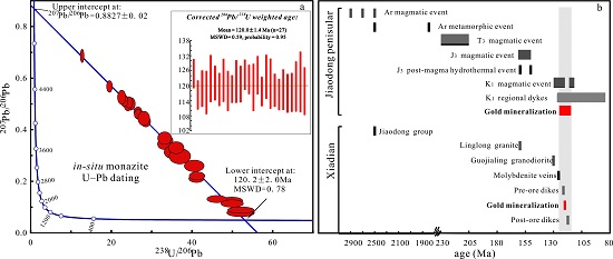 图2:独居石U-Pb定年结果(a)及胶东和夏甸金矿的年代学格架(b)