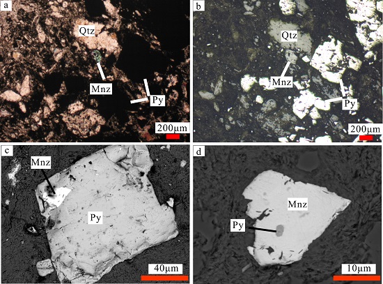 图1:独居石的显微镜镜下照片(a, b)及背散射图像(c, d)(Qtz-石英,Mnz-独居石,Py-黄铁矿)