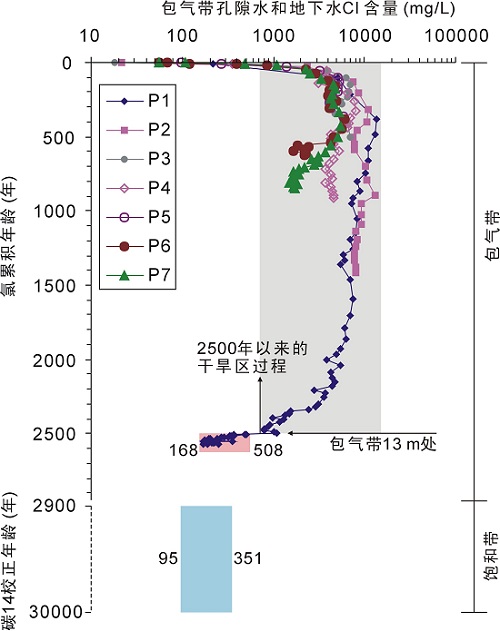 中科院地质地球所工程地质与水资源研究室黄天明副研究员、庞忠和研究员、牛津大学水资源研究中心原主任Mike Edmunds教授等人,将包气带和饱和带结合起来,利用多种环境示踪剂综合评价了鄂尔多斯西部某草原带过去3万年以来古水文情势。他们通过研究包气带(剖面最深21 m)和地下水,基于氯质量平衡原理得出现今平均补给量为0.11–0.32 mm/yr,包气带13 m以浅土壤水氯含量在2842–7856 mg/L,代表了近2500年的累积补给;而潜水(埋深30–70 m)是2900年以前补给的(14C校正年龄在4327–29708年),氯含量为95–351 mg/L(图1),显著区别于包气带浅部氯含量。这显示了近2500年以来的干旱化过程,该结果与西北干旱区的湖泊沉积记录等得出的结果相吻合。此外,研究发现,现今的水文过程与浅层地下水远未达到平衡,他们认为在干旱区地下水补给的研究中应得到重视。