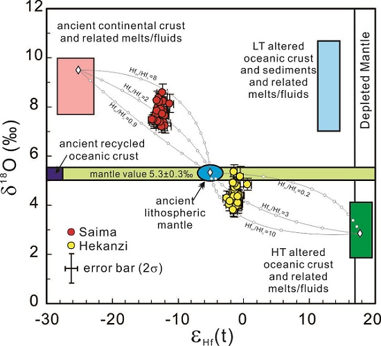 赛马碱性岩主要由碱性正长岩、霞石正长岩和异霞正长岩组成,而河坎子碱性岩主要由含霞石正长岩和碱性正长岩组成。前期全岩地球化学研究结果表明(Yang et al., Chemical Geology, 2012, 328: 149-167; Zhu et al., Journal of Asian Earth Sciences, 2016, 117: 184-207),二者形成于231~224 Ma,来源于富集岩石圈地幔,是低程度部分熔融形成的岩浆经历结晶分异和陆壳混染的结果,但富集岩石圈地幔的性质及其地幔交代形成过程却仍不清楚。他们在详细的锆石成因矿物学研究基础上,对锆石进行原位微区Hf-O同位素分析,分析结果显示,辽东赛马碱性岩中的岩浆锆石εHf(t)值为-11.2~-14.0,δ18O值为+7.1~+8.4‰,河坎子碱性岩中的岩浆锆石εHf(t)值为-2.5~+0.6,δ18O值为+3.8~+5.4‰,明显区别于华北克拉通古生代岩石圈地幔,它们分别是古老大陆地壳和高温蚀变洋壳等物质交代岩石圈地幔的结果。