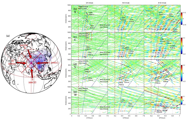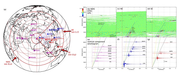 在地震发生7分钟之后,通过电离层TEC观测,他们发现距离震中1800公里范围内出现不同尺度的电离层CID扰动。扰动幅度~0.3 TECu(TEC unit,1 TECu=1×1016el/m2),周期2-12分钟,速度从500 m/s到 2.3 km/s(图1)。速度在~500 m/s以内的CIDs主要由地震激发的重力波引起,集中出现在震中以南600公里和震中以北700公里两个区域;而速度在700-1400 m/s左右的CIDs主要由地震激发的声波引起,在各个方向均可发现,与重力波引起的CIDs相比,声波引起的CIDs传播距离短,衰减快。第三种扰动是瑞利面波引起的CIDs。这是由沿地表传播的瑞利波激发大气波动、波动垂直上传到电离层高度引起的扰动,观测表明其传播速度在2-3 km/s之间,且集中在在震中以东地区被观测到,最远传播到震中以东1800km的距离。
