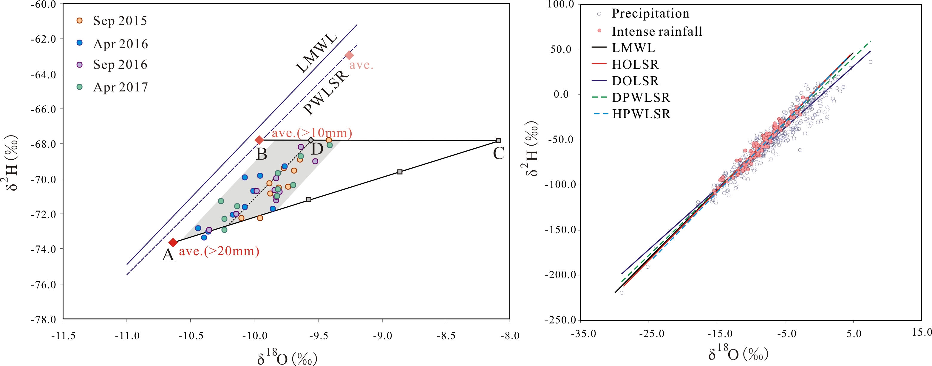 大气降水线(大气降水氘-氧同位素组成之间的线性关系)是同位素水文学第一定律,自Harmon Craig(1961)发现以来,在水文地质、生态、第四纪地质等学科领域中应用广泛。该线通常通过本地降水同位素的月(年)加权平均值线性回归得到,并称之为本地大气降水线。本地大气降水线是地下水补给研究的重要参考线,并假定地下水与大气降水在同位素组成上是一致的,即所有降水均补给到地下水,然而事实并非如此,不是所有降水都能补给地下水,因此筛选出对地下水补给有意义的降水事件,确定地下水补给输入项并建立大气降水线,对地下水研究具有重要意义。
