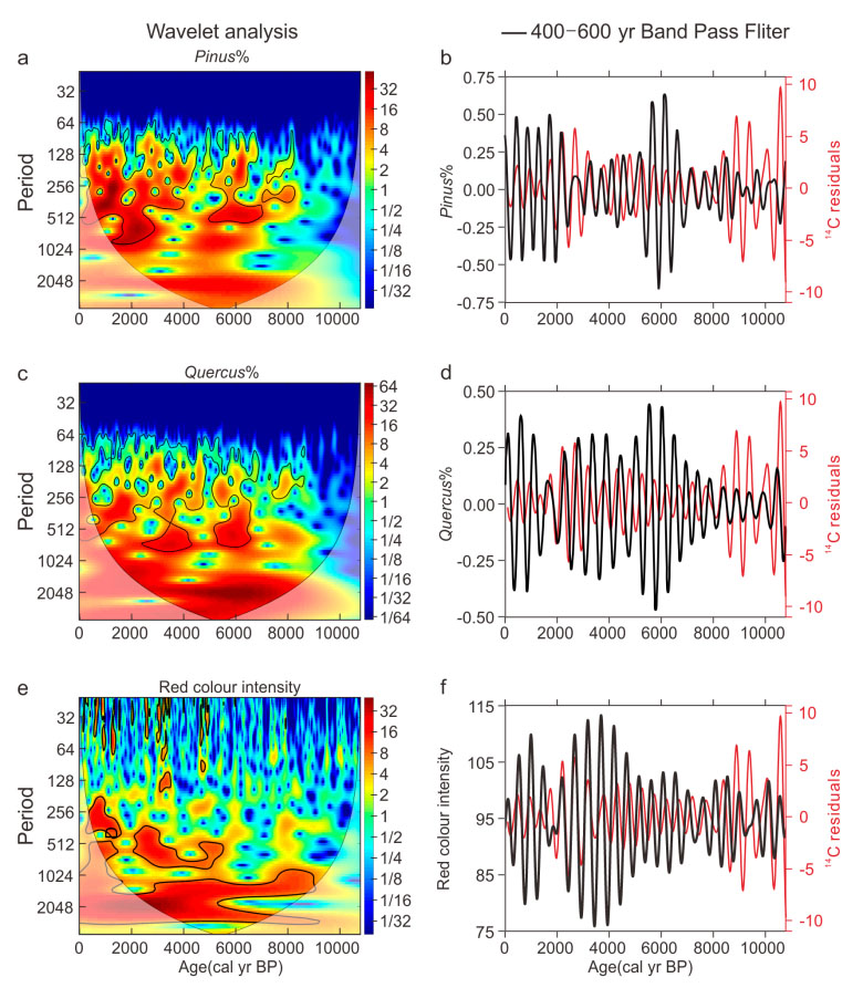 图2 月亮湖花粉记录和ENSO的小波分析和带通滤波。(a-d)月亮湖的Pinus(%)和Quercus(%)的小波分析和带通滤波结果;(e、f)Laguna Pallcacocha的El Nino记录的小波分析和带通滤波结果;红线是根据δ14C残差计算的带通滤波结果,指示了太阳活动变化