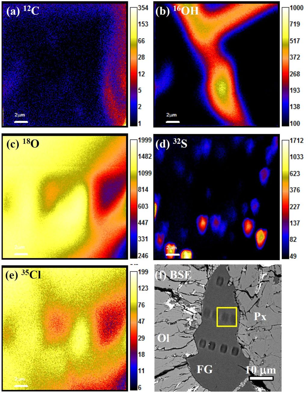 图1 NWA 6162火星陨石熔融包裹体中挥发份的分布特征。(a)12C,(b)16OH,(c)18O,(d)32S,(e)35Cl,(f)背散射电子图像。熔融包裹体的水呈现树枝状形态,富集在内部。相比,S以纳米到微米大小的颗粒产出,比较均匀的分布在熔融包裹体内,可能是金属硫化物