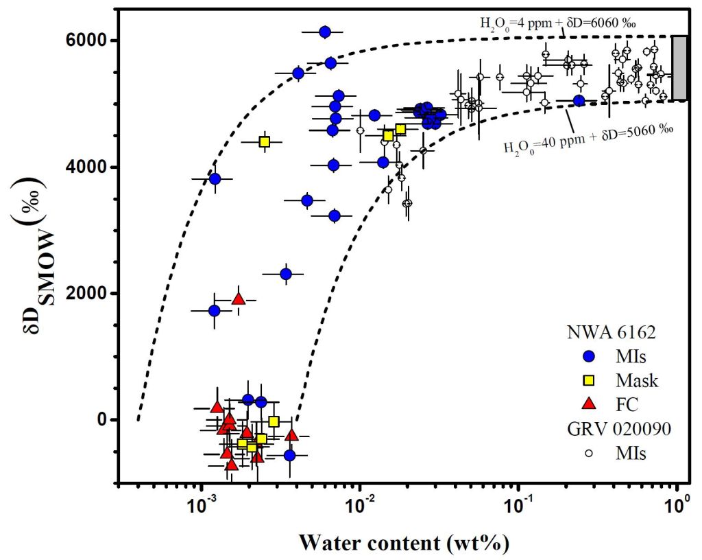 图2 NWA 6162火星陨石中熔融包裹体(MIs)、熔长石(Mask)和熔壳(FC)的水含量和H同位素的相关性。NWA 6162熔融包裹体的水含量与H同位素具有对数正相关关系,代表两端元混合过程,即火星幔与火星浅表水(灰色长方形所示区域)的混合。同时,该相关性也表明熔融包裹体现在记录的水大部分来自火星浅表