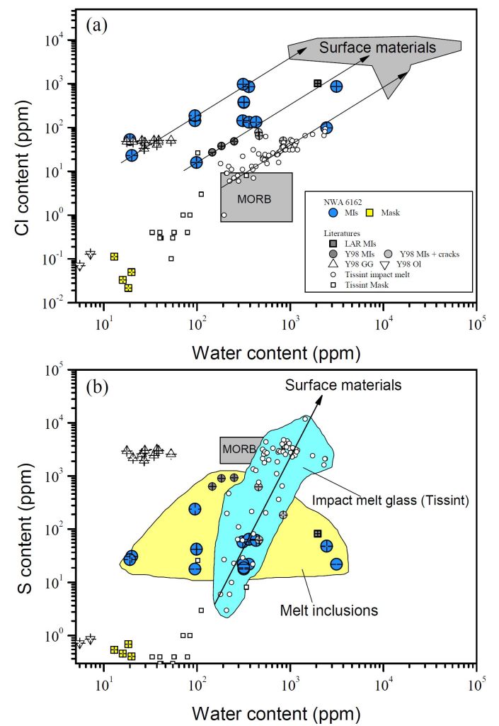 图3 NWA 6162火星陨石熔融包裹体的水含量与S和Cl含量的相关性。(a)Cl与水含量具有正相关关系,说明熔融包裹体的水和Cl主要来自火星浅表,而非火星幔源;(b)S含量与水含量无明显相关性,说明S几乎没有受到火星浅表物质的混染,可以代表火星幔源