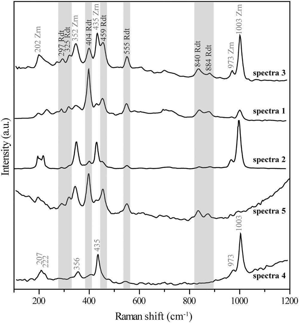 图2 雷锆石(Rdt)和锆石(Zrn)的激光拉曼谱,分析位置见图1