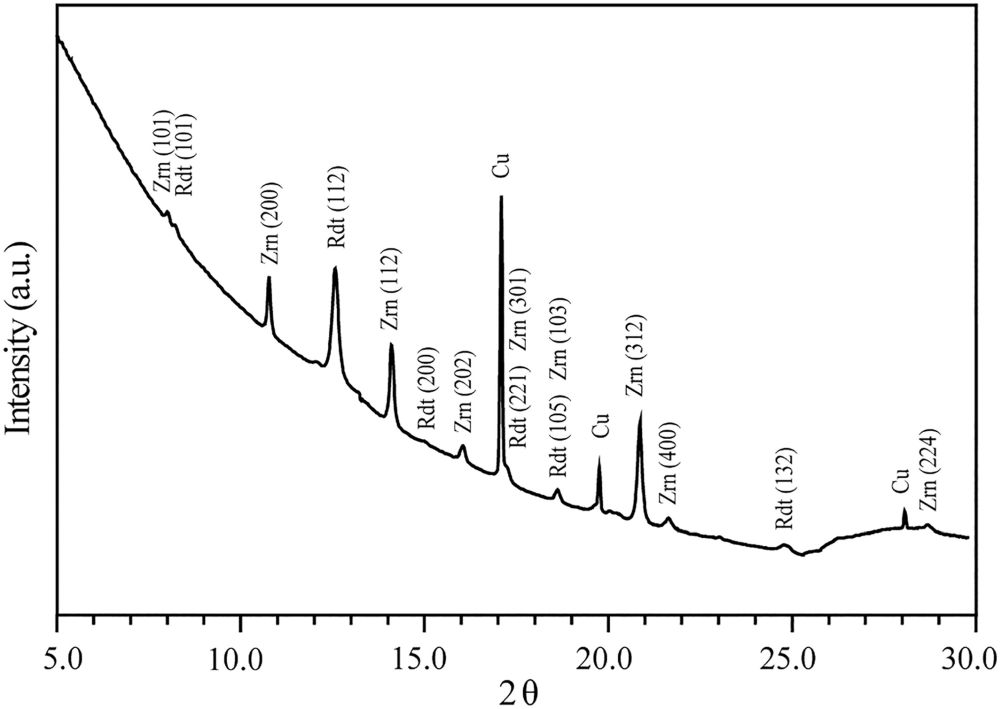 图3 雷锆石-锆石颗粒(C-13)的同步辐射x-射线衍射结果。Cu为铜网,Rdt为雷锆石,Zrn为锆石