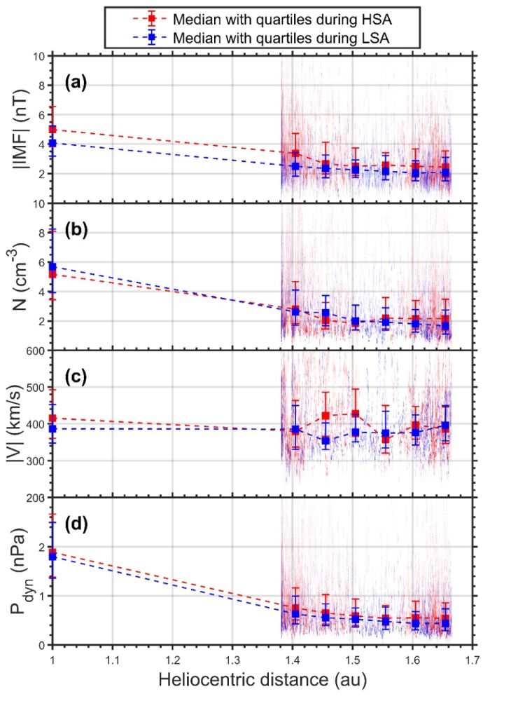 中国科学院地质与地球物理研究所地球与行星物理院重点实验室的博士研究生刘迪及导师戎昭金研究员、魏勇研究员等,利用美国MAVEN火星探测器2014-2020年期间的高精度离子和磁场观测数据,首次对火星上游太阳风的密度、速度和动压及行星际磁场的强度、锥角、时钟角等物理参数展开了全面的统计分析研究,并结合地球1AU(AU为日地距离单位,约1.5亿公里)处的OMNI太阳风数据集,研究了在1-1.7 AU范围内,太阳风等离子体参数和行星际磁场随日心距离及太阳活动性的变化分布(图2)。