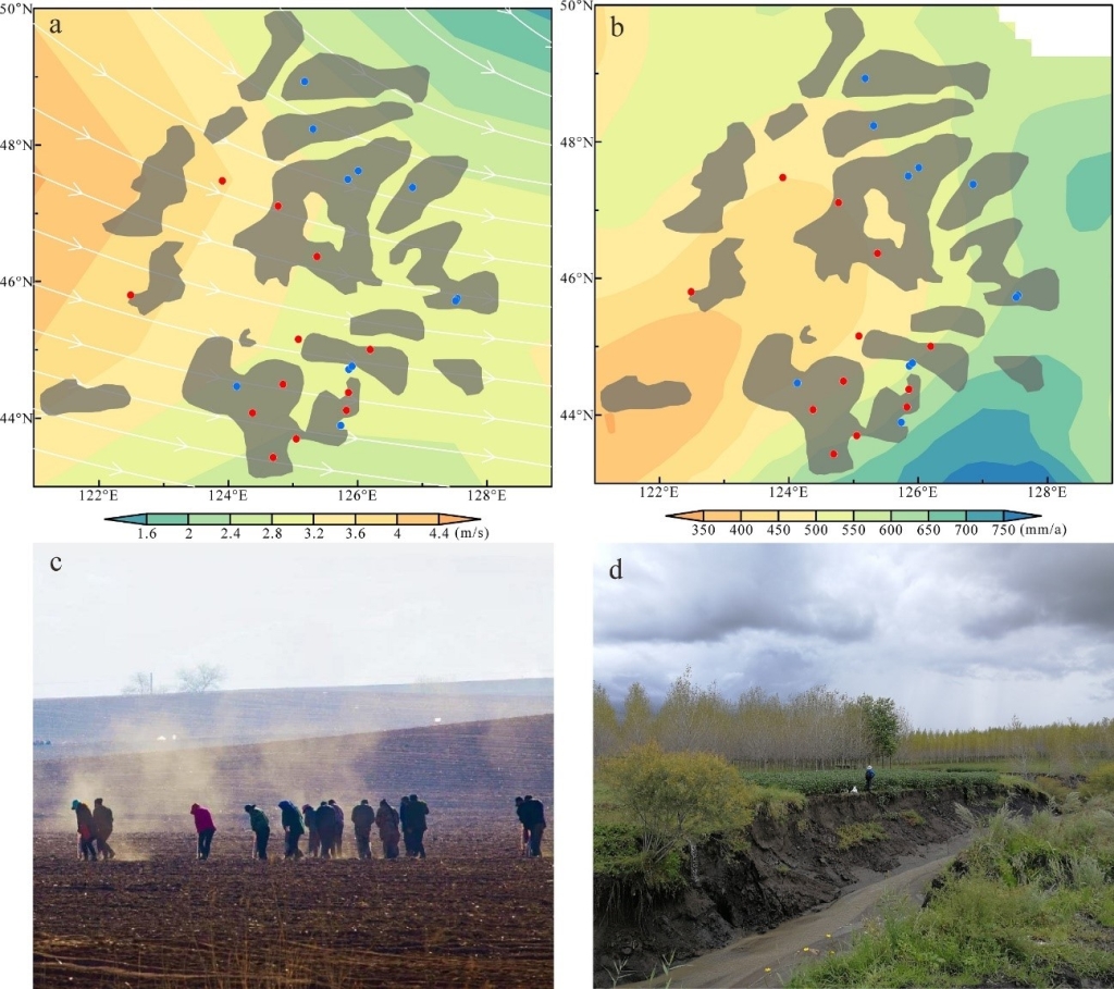 图4 东北地区现代沙尘暴季节(2-4月)1000 mb平均风速(a)、年平均降水量(1961-2016年)(b)、风蚀(c;图/中国国家地理)与水蚀冲沟(d;图/郭利成)。灰色区域表示黑土;白色箭头表示风向;红色点表示本研究点,蓝色点表示前人研究点