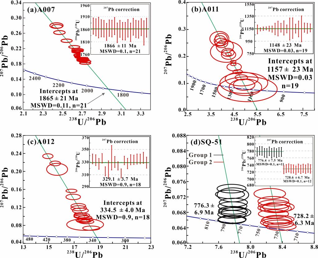 图2 ID-TIMS测定 (a) A011(美国)、(b) A012(德国)、(c、d) A007(瑞典)褐帘石样品U-Pb年龄谐和图。其中,(a-c) 多伦多大学测试,(d) 德国地学研究中心测试