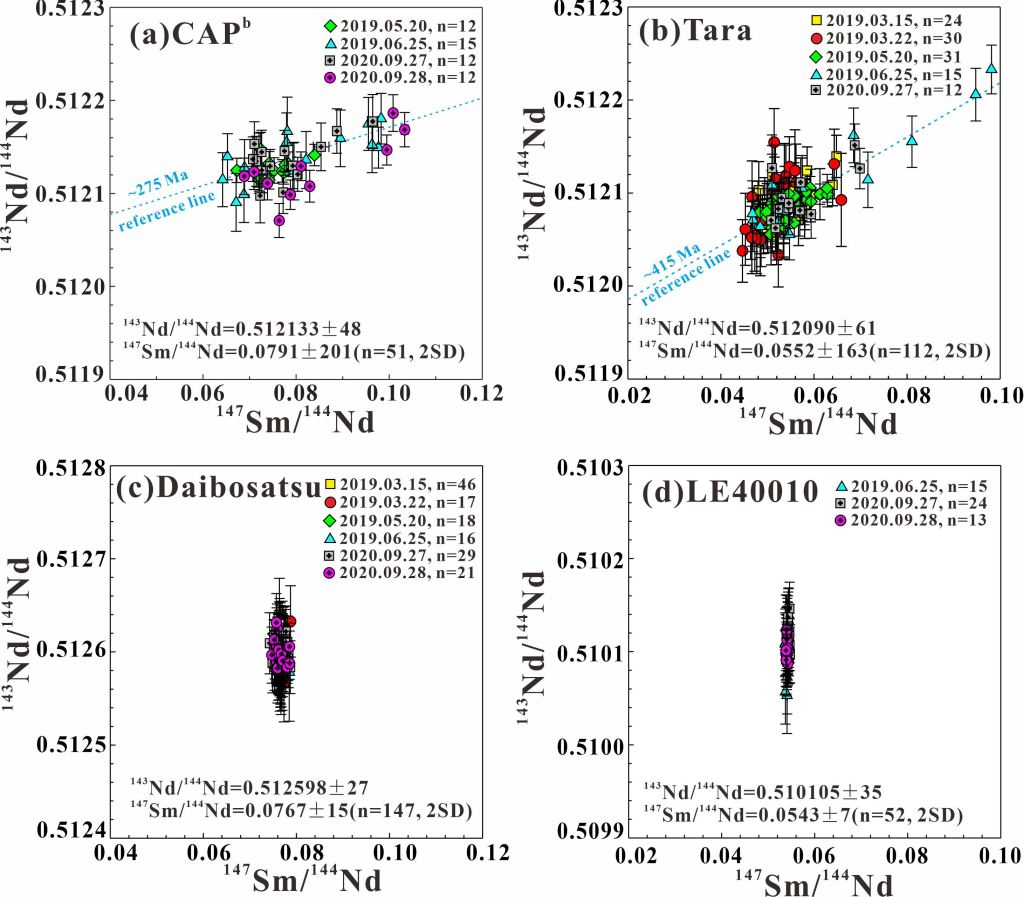 图3 采用LA-MC-ICP-MS方法获得的褐帘石样品 (a) CAPb (意大利)、(b) Tara (澳大利亚)、(c) Daibosatsu (日本)、(d) LE40010 (丹麦)的Sm-Nd同位素分析结果。