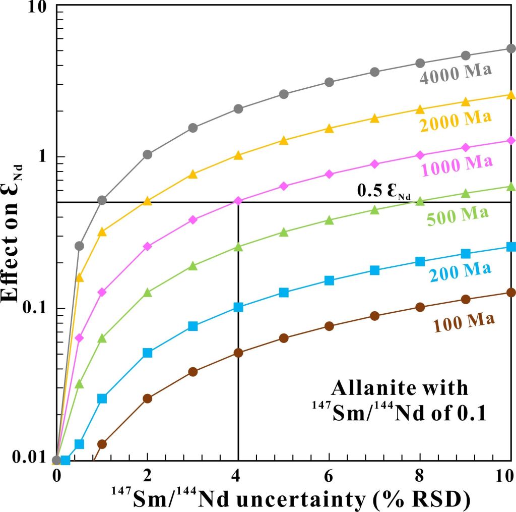图4 147Sm/144Nd比值的不确定度对不同年龄褐帘石样品的εNd(t)精度影响