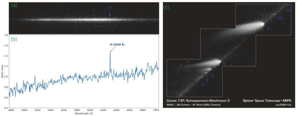 73P/Schwassmann–Wachmann 3是一颗短周期的木星族彗星,轨道周期为5.4年,由Arnold Schwassmann 和 Arno Wachmann于1930年共同发现。1995年,彗星开始分裂成5块碎片。在其返回近日点期间,经历了多次爆发,并分裂成许多碎片。通过望远镜对73P/Schwassmann-Wachmann 3彗星进行光谱观测,发现了此彗星具有典型的OI原子发射线(图1)。