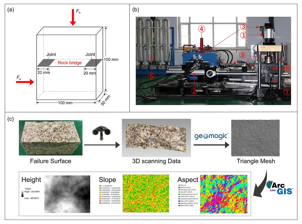 中国科学院地质与地球物理研究所页岩气与地质工程院重点实验室祁生文研究员率领团队基于自主研发的大型岩体动态性能测试系统,对地壳内广泛发育的花岗岩开展了“岩桥”剪切速率效应研究(图1a和图1b)。试验的花岗岩样品为尺寸100 mm×50 mm×100 mm的六面体试样,“岩桥”长度60 mm。该研究在花岗岩“岩桥”上进行了剪切速率为1 μm/s至10 mm/s(低速率至亚地震速率)的直接剪切实验,并通过将三维激光扫描与ArcGIS集成技术来定量表征破裂面形貌(图1c)。