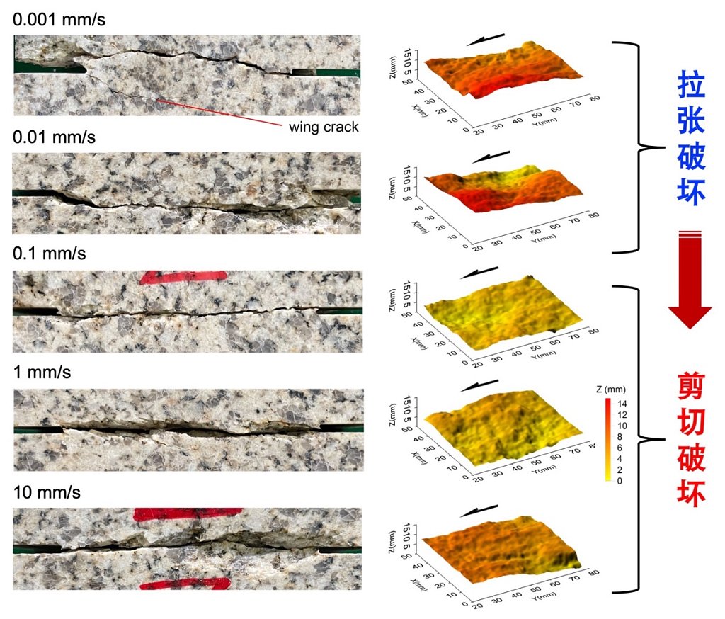 研究结果深化了对岩体破坏速率效应的认识,有助于理解自然岩体中具有类似“岩桥”特征的结构(例如非均质断层中的局部高强度段)在局部变化加载速率下的力学行为。同时,破裂面三维形貌结果还表明在断层表面粗糙度演化模型中应考虑速率效应的影响。