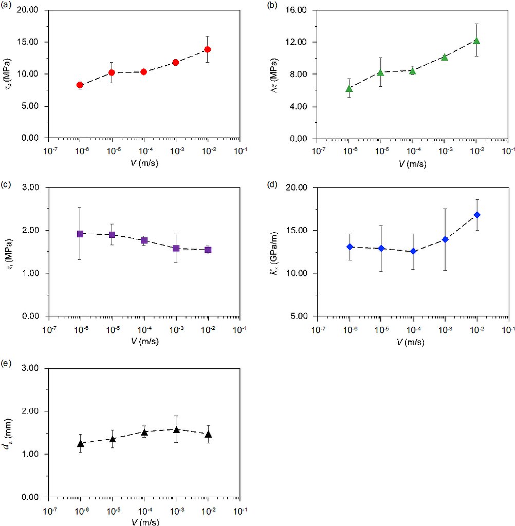 图3 力学参数对剪切速率的依赖性:(a)峰值剪切强度;(b)应力降;(c)残余剪切强度;(d)剪切刚度和(e)峰值剪切位移