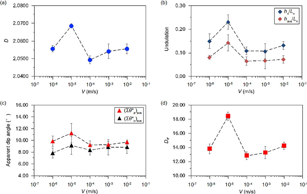 结果表明,“岩桥”破坏模式从低剪切速率(0.001 mm/s和0.01 mm/s)下的拉张破坏转变为亚地震剪切速率(0.1 mm/s至10 mm/s)下的剪切破坏(图2)。这导致了“岩桥”剪切强度和破裂面形貌特征对剪切速率都具有显著的依赖性(图3,图4):在低剪切速率下,“岩桥”发生拉张破坏,形成弯曲的贯通形式和起伏的破裂面形貌。在亚地震剪切速率下,则观察到剪切形成的平直贯通形式,峰值剪切强度和形貌粗糙度随着剪切速率的增加而增加。通过分析破裂贯通形式和破裂面三维形貌参数的变化,发现不同破坏模式下,“岩桥”破裂面形貌的各向异性指标均与剪切速率呈正相关,且拉张破裂面形貌较剪切破裂面具有更强的各向异性特征。同时,研究认为强度等力学特性及破坏模式的速率依赖性可能源于不同速率下所调动的微裂纹机制及其能量和几何特征。本文厘定了“岩桥”由拉张破坏转变为剪切破坏的临界剪切速率范围(0.01 mm/s至0.1 mm/s),该临界剪切速率取决于不同类型微裂纹的占比,因而与岩性、温度和法向应力等条件密切相关。
