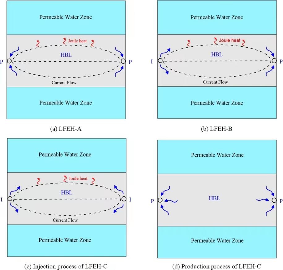 中国科学院地质与地球物理研究所油气资源研究院重点实验室博士生张琦与导师王彦飞研究员提出了采用低频电加热辅助降压方法来开采中国南海神狐海域的非受限天然气水合物矿藏,并基于双水平井设计了三种低频电加热开采方案,即LFEH-A(两井降压结合低频电加热)、LFEH-B(一井降压一井注盐水结合低频电加热)和LFEH-C(两井交替进行降压和低频电加热,即热吞吐法)(图1)。