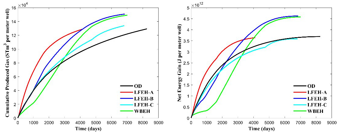为了确定最优的电加热生产方法,他们还比较了低频电加热与井筒电加热(WBEH)的模拟结果。井筒电加热在甲烷和能量回收方面与低频电加热旗鼓相当。但是,由于更均匀的电热分布,低频电加热的地层温度要远低于井筒电加热,可以避免井筒因持续高温而失稳(图3)。最后,电加热参数对生产和成本的敏感性分析表明,为了避免不必要的能量浪费,低频电加热应该在一个适当的时间提前停止,同时提高低频电加热功率可以增加甲烷回收及净能量获得。此外,与只降压相比,低频电加热方法虽然具有更好的经济潜力,但仍然不能满足天然气水合物的商业生产标准,储层改造技术应在未来研究中予以考虑。