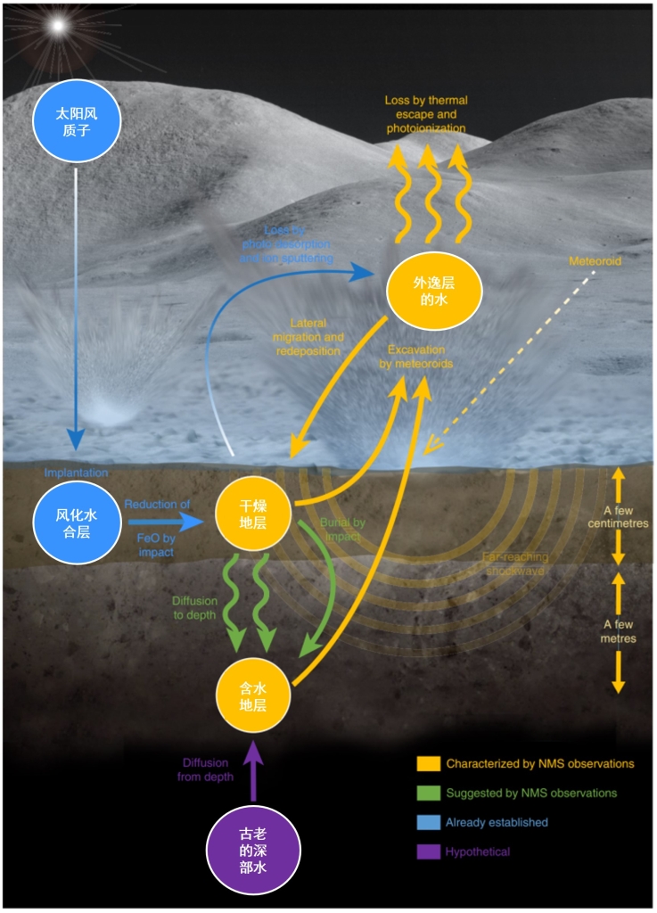 月球是无大气天体的典型代表,探测次数最多,其表面水分布和含量的认识也最全面。“克莱门汀”、“月球勘探者”、“月船一号”、月球南极撞击实验等一系列探测任务对月表水的含量和分布进行了比较全面的探测,发现月表水存在几个典型特征:(1)月表水呈现明显的纬度差异,高纬度地区明显比低纬度的水含量高,极区可能存在水冰(Clark, 2009; Sunshine et al., 2009)。(2)月表水的含量呈现与月球的昼夜变化相关的特性,相同位置在晨昏时刻的水含量明显比中午时刻高(Sunshine et al., 2009; Wohler et al., 2017)。(3)月表水的含量仅为10-1000 ppm (Clark, 2009),局部有比较高的区域(Li and Milliken, 2017)。这些特征说明,月表虽然有水,但含量低,且动态变化,暗示月表水可能随时间会发生迁移。“月球大气与尘埃环境”探测任务检测到月球空间环境中的水分子逃逸,逃逸的时间与流星雨事件相关,但是月球表面输入水量明显小于月球空间的水逃逸量,因此推测流星雨撞击月球时把月壤中储存的一部分水蒸发到月球空间导致逃逸,进而提出了月表水循环(Lunar surface water cycle)猜想(Benna et al., 2019)。该猜想认为,月表10厘米到3米区域可能有一个未被发现的储水层(图2)。