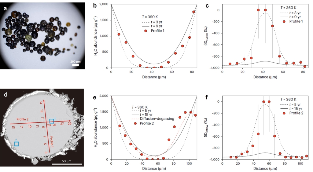 图3 嫦娥五号撞击玻璃珠(CE5#33, 036)水含量和氢同位素剖面。a为CE5撞击玻璃珠的光学图像,b-c为剖面1分析结果,e-f为剖面2分析结果(剖面2与剖面1垂直如d所示)。b图表现出水向内部扩散的特征,c, f图通过氢同位素组成示踪扩散水为太阳风成因(极端贫氘),e图在扩散的基础上还记录了水释放的信息