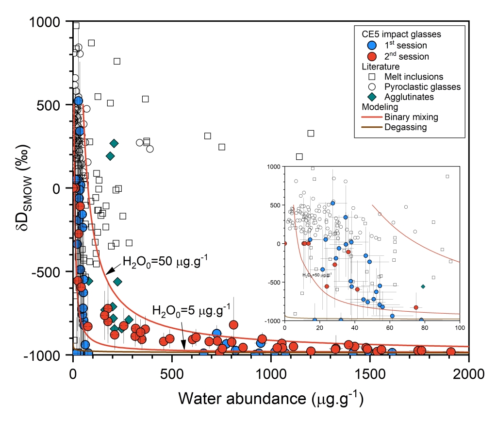 图4 嫦娥五号月壤中撞击玻璃珠水含量与氢同位素的负相关性。撞击玻璃珠的水含量和氢同位素可以用二元混合模型进行约束(红色实线),两个端元分别为太阳风成因水(δD = -990‰, H2O=2000 ppm)和玻璃珠内生水(δD = 500‰, H2O0=5-50 ppm)。同时模拟了H2去气(棕色实线),去气模型并不能实现玻璃珠中观察到的氢同位素组成
