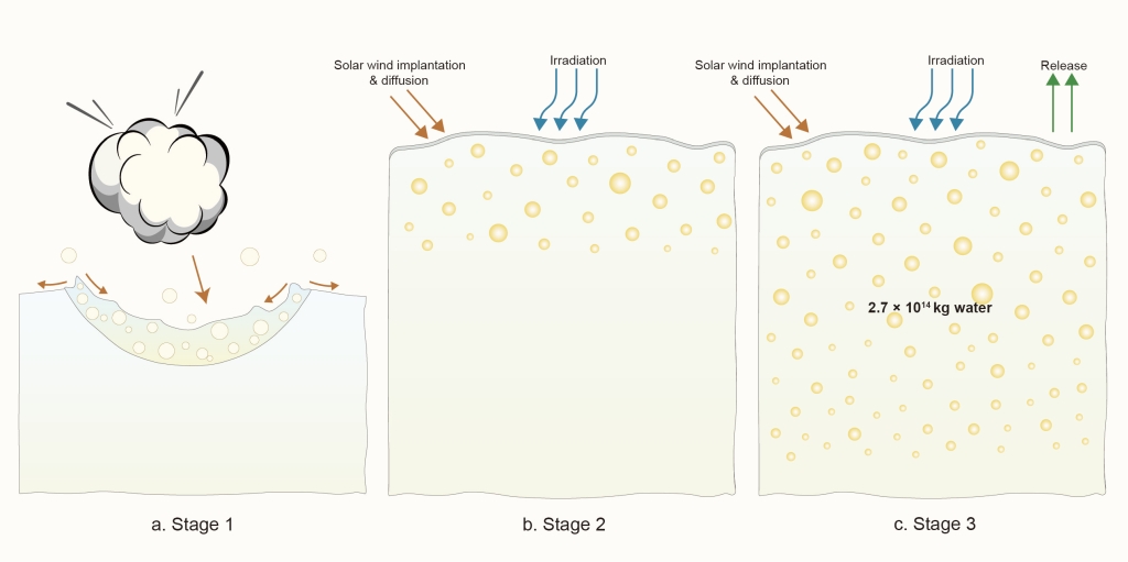 图5 撞击玻璃珠参与月表水循环模式图。Stage 1: 撞击玻璃珠的形成,该过程伴随着强烈的冲击,形成的玻璃珠均匀干净,几乎失去了其所有的挥发性成分。Stage 2: 太阳风质子注入颗粒表面形成水合分子,而后水向玻璃珠内部扩散。Stage 3: 携带水的玻璃珠在月表“翻耕”作用下向月壤深处转移,形成月壤中的“水库”。表层新形成的玻璃珠继续接受太阳风成因水的扩散,同时在温度升高的条件下(光照或陨石撞击),水被释放到月球外逸层