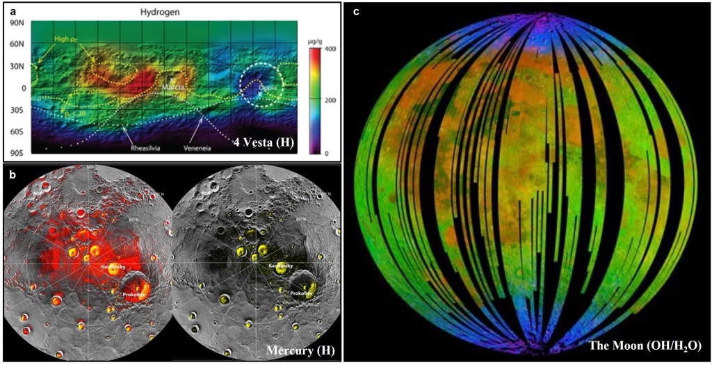 图1 灶神星、水星和月球表面水的分布特征。(a)“黎明号”获得的灶神星全球性氢含量分布特征(Prettyman et al. (2012);(b)“信使号”探测任务获得的水星极区及高纬度地区的氢含量分布特征(Lawrence et al., 2013);(c)“月船一号”探测任务获得月球表面的羟基(OH)或水分子(H2O)分布特征(Pieters et al., 2009)