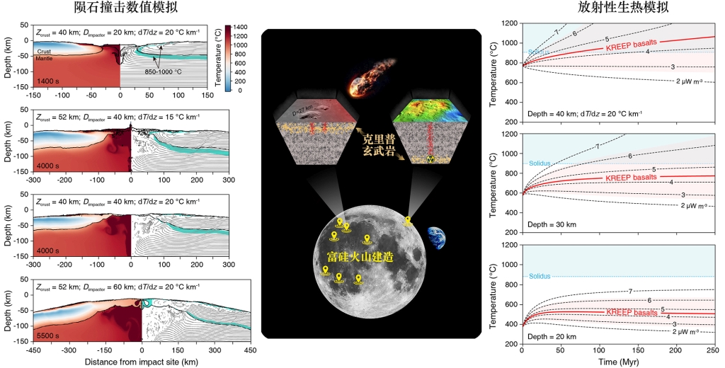 为了破解这一谜团,中国科学院地质与地球物理研究所苏斌副研究员和陈意研究员,联合岳宗玉研究员、陈林研究员、R. N. Mitchell研究员、杨蔚研究员、黄广宇副研究员、郭敬辉研究员、李献华院士、吴福元院士和北京大学唐铭教授,对月球表面出露的所有岩石类型(高地斜长岩、镁质岩套、碱性岩套、克里普玄武岩、低钛玄武岩和高钛玄武岩)开展了系统的热力学模拟工作,定量计算月壳岩石部分熔融的条件和熔体成分,然后通过放射性生热模拟和陨石撞击数值模拟,限定了月壳再熔融的发生机制,获得如下新认识: