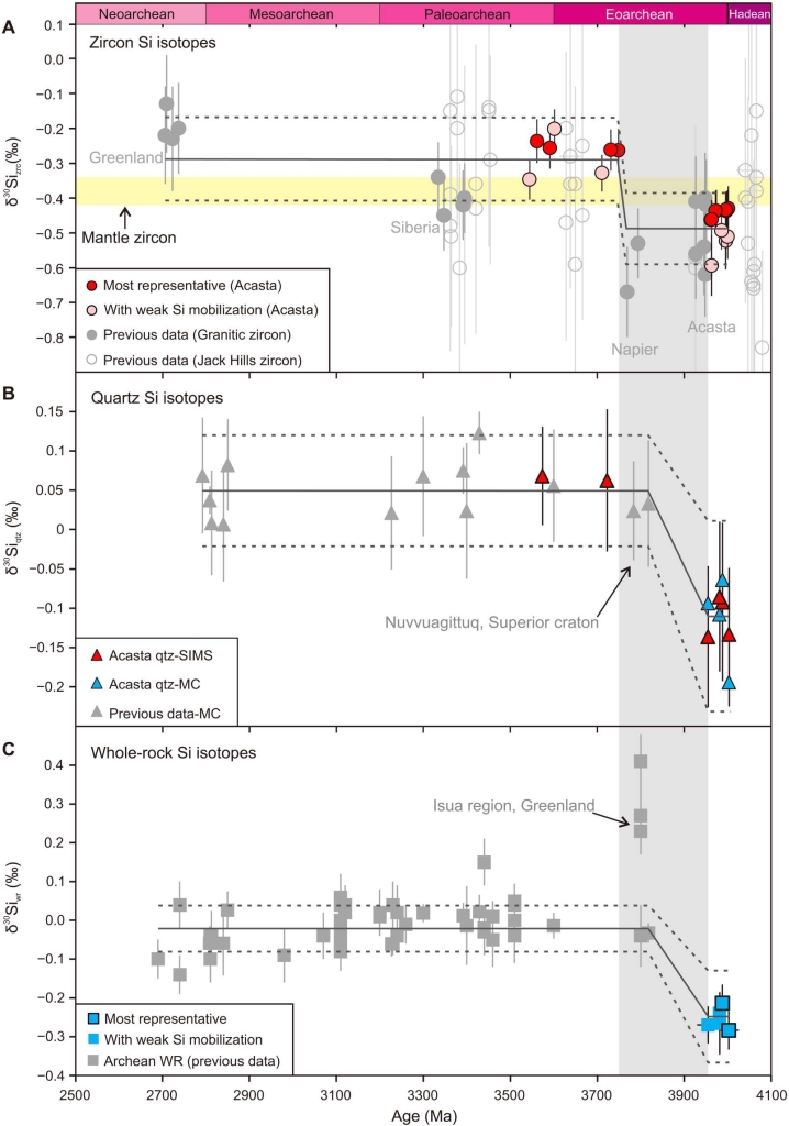 图3 在40–25亿年前,海水中硅含量饱和,硅化洋壳富含重硅。研究发现最古老的40亿年的岩石形成过程中没有表壳重Si物质的加入,在大约38亿年以来,表壳的重Si同位素信号才开始出现在花岗质岩中