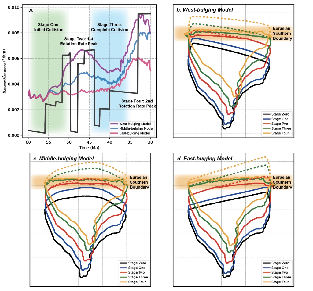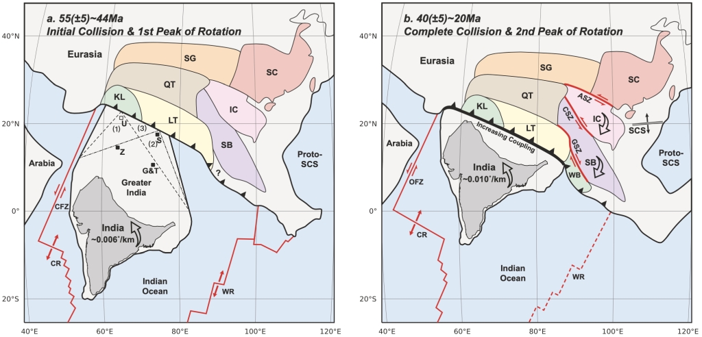 基于观测与模拟的印度板块旋转特征,研究团队提出印度大陆北缘的中西侧在55 5 Ma与欧亚大陆初始碰撞,随后向东发生穿时碰撞,在40 5 Ma时与欧亚大陆完全碰撞(图4)。这种推断得到了一系列沿缝合带关键地质证据的支持。此外,33-20 Ma的旋转峰期被认为对应着全面碰撞后板块之间的耦合增强。这与青藏高原东南缘多个地块挤出逃逸的时间吻合,南海海底扩张也在相近的时间发生。强烈的板块旋转与陆内构造变形可能共同指示了该时间段印度与欧亚板块的强烈耦合作用(图4)。